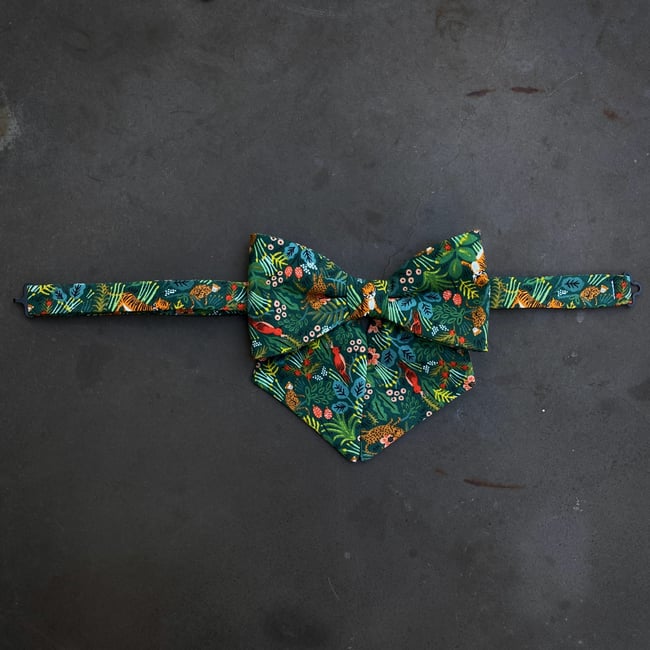 Fox & Brie lady bows are handcrafted in my Austin, Texas studio in limited editions using a mixture of new, vintage, and deadstock fabrics. They are pre-tied, with an adjustable band and hidden clasp closure. Remove the neckband, and clip it onto your hair, bag, or outfit. A fun twist on an old classic!